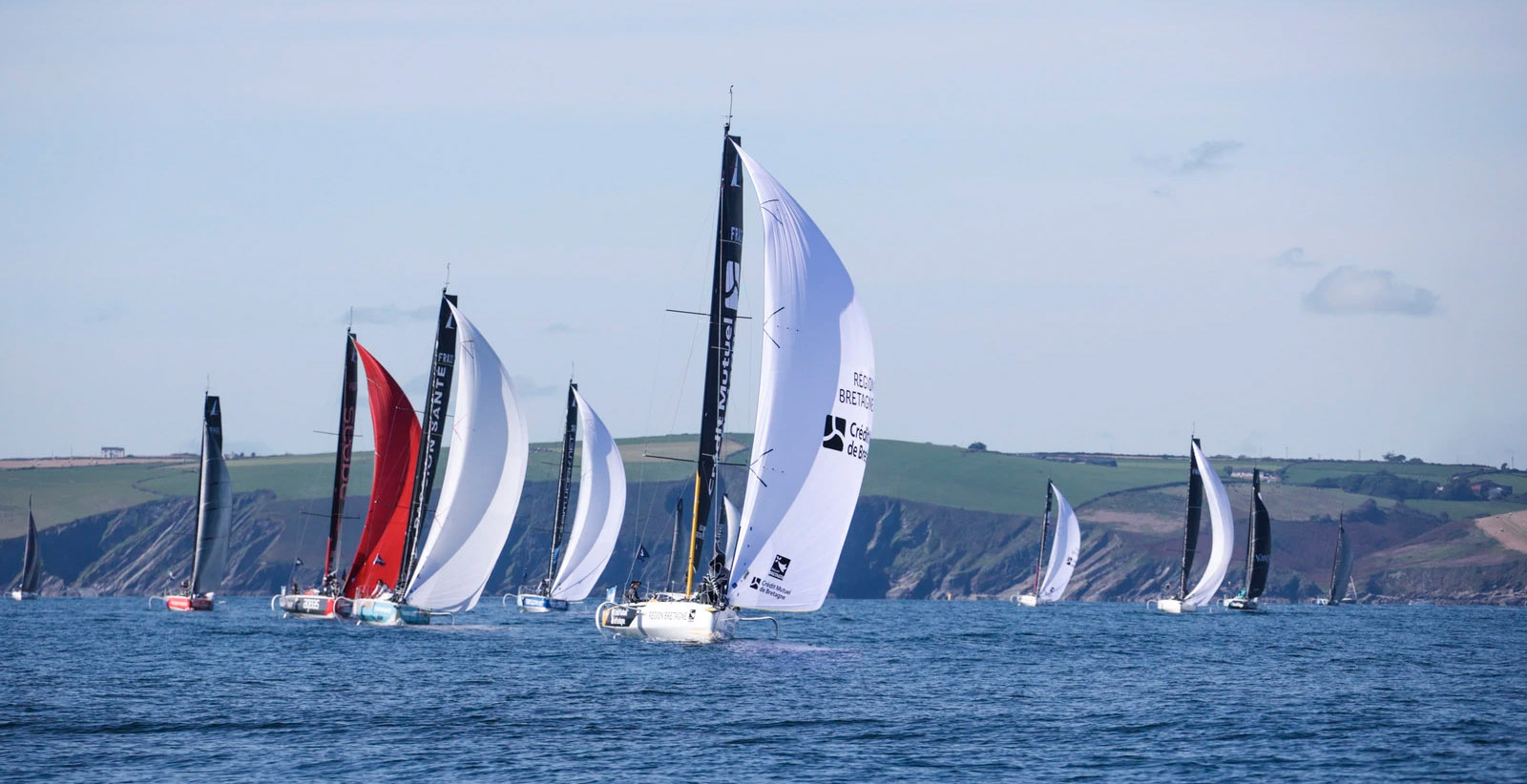 Dans ces conditions très instables et pour rejoindre la première bouée de dégagement mouillée deux milles plus loin dans l’est, les spis sortent progressivement des soutes à voiles. À petite cadence, Gaston Morvan (Région Bretagne - CMB Performance), qui visiblement apprécie les petits côtiers de mise en bouche, se présente en tête à la première marque. Romen Richard (ID Voile Passion Santé), Maël Garnier (J’M Garnier), ou encore Philippe Hartz (Marine Nationale - Fondation de la Mer) ont rejoint le petit groupe qui emmène la flotte défiler le long des côtes escarpées.