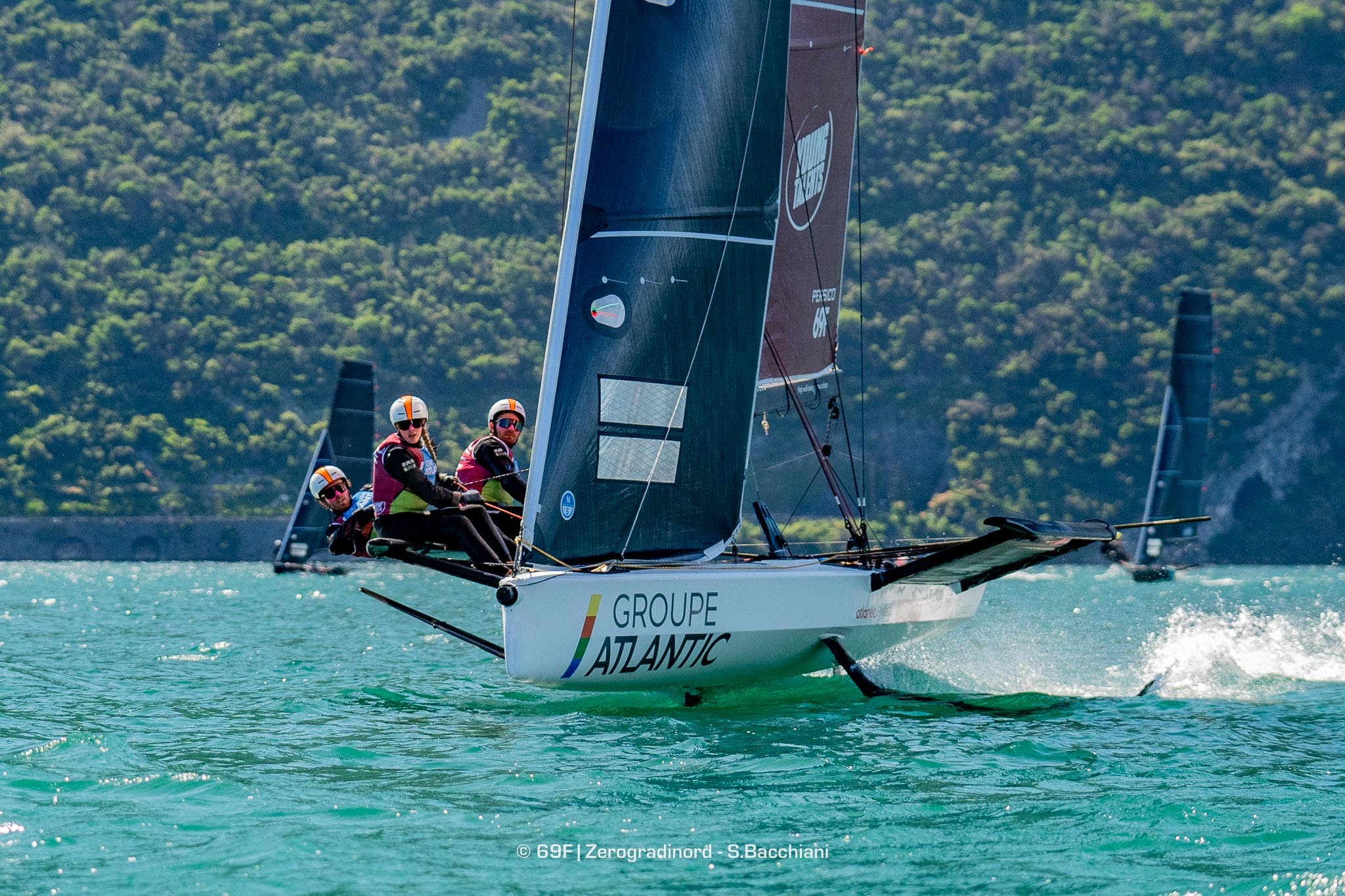 Après un premier acte à Malcesine, la 69F Cup retrouvait le cadre enchanteur du Lac de Garde, du côté de Torbole cette fois, pour le 2e rendez-vous de la saison. Sur ces monocoques à foi électrisants, « petits frères » des AC75 et des AC40 de la Coupe de l’America, de la Youth America’s Cup et de la Women America’s Cup, l’équipage français de « Groupe Atlantic », composé de Clément Cron, Louis Chambet et Jessica Berthoud, s’est imposé. Les tricolores en ont profité pour prendre la tête du classement général après deux étapes.