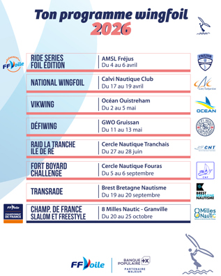 La saison se clôturera avec du slalom et du freestyle au Championnat de France à Granville, où talents d’aujourd’hui et de demain se disputeront les titres nationaux. Les grands événements Wingfoil 2026 promettent une saison complète, innovante et accessible, où engagement, plaisir de naviguer et esprit de communauté seront au cœur de chaque rendez-vous. Une saison à vivre pleinement sur l’eau.