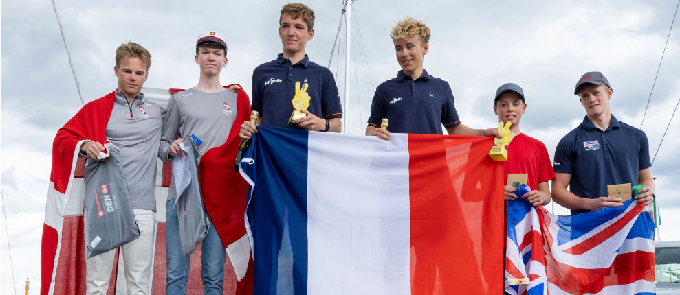 Des vrais spécialistes du Skiff nos petits Français ! Quelques mois après le titre d’Hugo Revil et Karl Devaux au Mondial Jeunes à Oman, Tom Goron et Mael Clochard ont remporté le titre Européen en 29er cette semaine au Danemark. Les jeunes marins du SNO Nantes ont montré une grande maitrise tout au long de la compétition du côté de Rungsted, disputée dans des conditions variées, jusqu’à la course finale et un départ anticipé qui leur a couté le titre Open, remporté par les néo-zélandais George Lee Rush et Seb Menzies. Tom et Mael auront tout de même marqué les esprits, avec le titre européen et la victoire au classement U17 également !